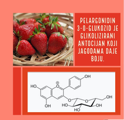 Pelargonidin 3-O-glukozid je glikolizirani antocijan koji jagodama daje boju. Ovo znači da je molekula pelargonidina pridružena molekuli jednog šećera, glukoze. U manjoj mjeri, u jagodi je nađen i cijanidin – 3-O- glukozid.