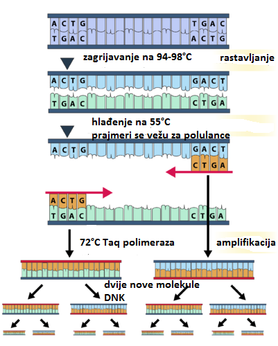 PCR je akronim za Polymerase Chain Reaction, proceduru koju je 1983. razvio nobelovac Kary Mullis, a koja suštinski predstavlja zagrijavanje i hlađenje uzorka izolirane DNK na određenim temperaturama – kada su temperature više, oko 94°C(do oko 98 °C), lanci DNK se rastavljaju jer slabe hidrogenske veze između azotnih baza. Negdje ćete pročitati da se DNK “topi” ili denaturira – kako god, samo je bitno da znate da se pri zagrijavanju na ovim temperaturama ne uništavaju fosfodiesterske veze između dezoksiriboze i fosforne kiseline, nego samo hidrogenske veze između komplementarnih baza. Pri hlađenju DNK na temperature od oko 55-60 °C, hidrogenske veze se ponovo uspostavljaju.